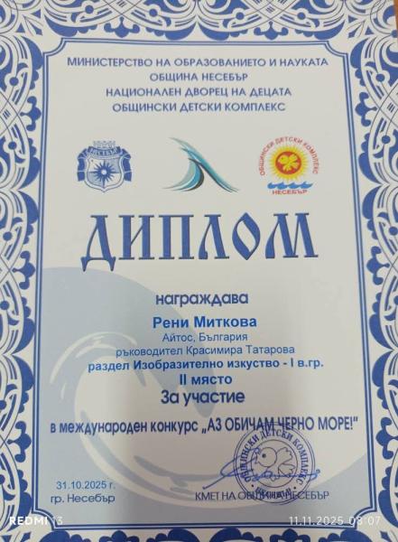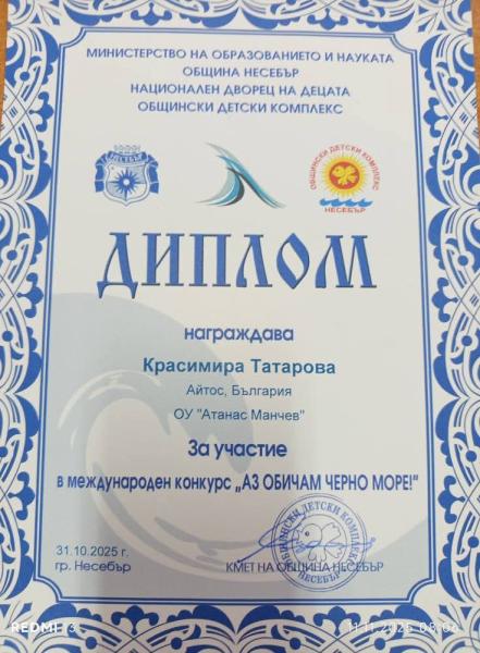 Директорът на ОУ "Атанас Манчев", г- жа Силвия Томова, лично връчи грамота на Рени Наскова Миткова от 2. а клас за блестящото и представяне в конкурса "Аз обичам Черно море". Гордеем се с нашите участници, които с труда и таланта си показват, че успехът идва с постоянство и желание за развитие.