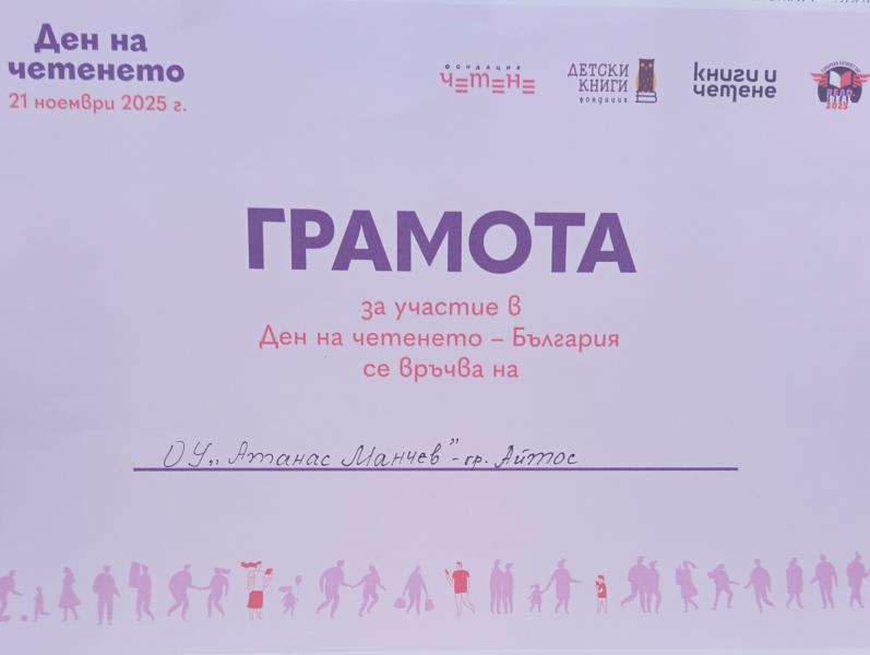 Грамота за активно участие на всички класове в Ден на четенето-България 2025 г. Третото издание се проведе в периода от средата на ноември до средата на декември 2025 г., за да бъде България в синхрон с европейските събития, част от Деня на европейските автори Read for Real. В 34 държави в Европа бяха регистрирани общо 6573 Read for Real събития. 4538 от тях са подадени от българи – част от Деня на четенето 2025!